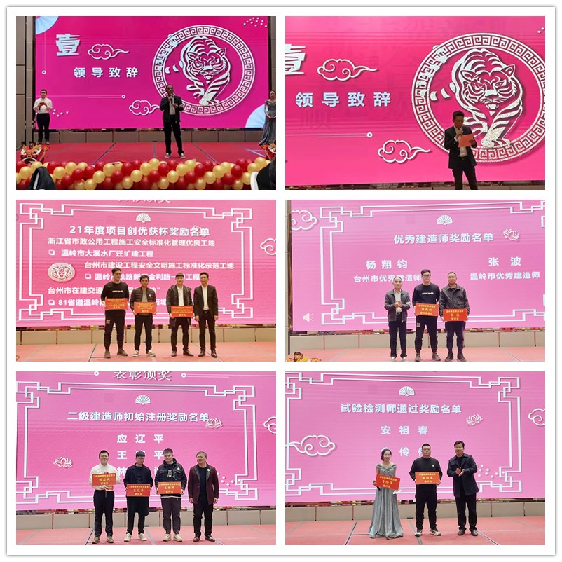 金牛俯首辭舊歲,瑞虎騰躍迎新春!告別難忘的2021,邁向全新的2022。2022年1月8日,浙江眾一建設工程有限公司2021年度企業年會暨表彰大會在溫嶺市耀達國際大酒店紫金廳圓滿舉行,公司全體員工和公司領導歡聚一堂。同時大會榮幸邀請到了溫嶺市交通運輸局潘華榮局長、應文明指揮與會指導。