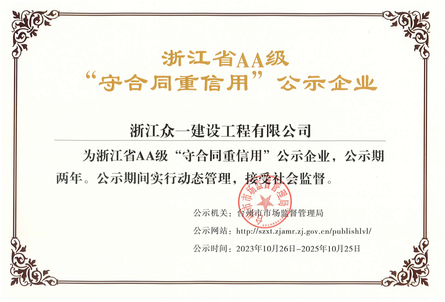 我司自成立以來,始終秉承誠信立本的經營理念和發展原則,不斷完善企業合同信用體制,打造誠信信用管理體系建設,此次能夠獲評“浙江省AA級守合同重信用企業”,是政府部門及市場行業對我司重視合同信用體制和良好守信履約能力的認可。